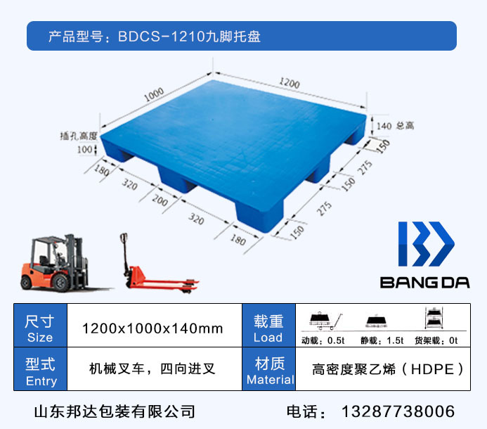 九腳塑料托盤,即根據(jù)托盤的外形來看,這種類型的托盤底部是九腳,因此得名九腳塑料托盤。一般這種裝載比較輕,不適合上架裝載貨物,也不適合轉(zhuǎn)運(yùn)重物。九腿托盤一般用作倉庫的輕貨墊板,叉車用于翻輕貨。這樣的盤面形狀有:平面和網(wǎng)格之分。