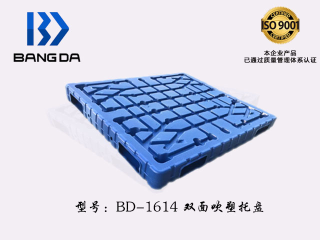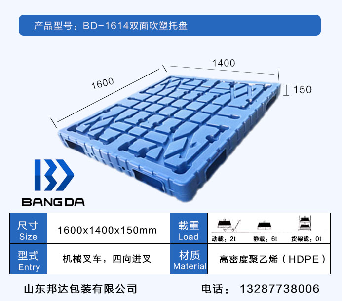 BD-1614雙面塑料托盤尺寸為1600*1400*150(mm),采用國內最先進的吹塑技術,原材料采用的是HDPE一種結晶度高,非極性的熱塑性樹脂;邦達的雙面塑料托盤承載強,耐高溫且環保;山東邦達包裝有