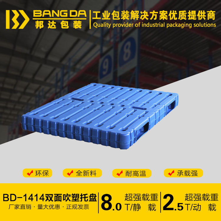BD-1414雙面塑料托盤(pán)尺寸為1400*1400*150(mm)采用國(guó)內(nèi)最先進(jìn)的吹塑技術(shù),原材料采用的是HDPE一種結(jié)晶度高,非極性的熱塑性樹(shù)脂;邦達(dá)的雙面塑料托盤(pán)承載強(qiáng),耐高溫且環(huán)保;山東邦達(dá)包裝有
