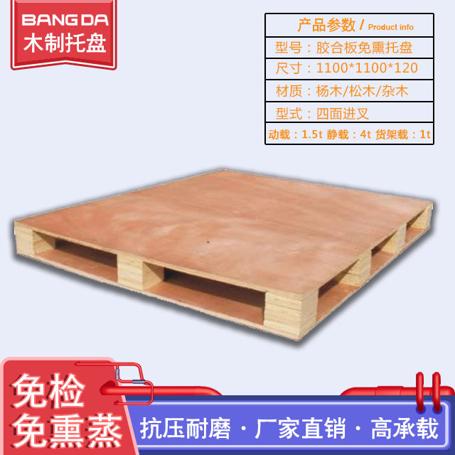 膠合板托盤的最大特點:出口免熏蒸、無蟲蛀、免熏蒸、免消毒,不受時間限制。可直接出口歐美及世界各國。該產品符合世界各國的入境和環保要求,是出口產品的好幫手。(膠合板屬于人造板類材料又叫三合板),均選用厚度12~18mm 的優質板材做為托盤原料,堅固耐用,除可生產符合各國標準的產品外,也可根據用戶需求訂做各種尺寸托盤。